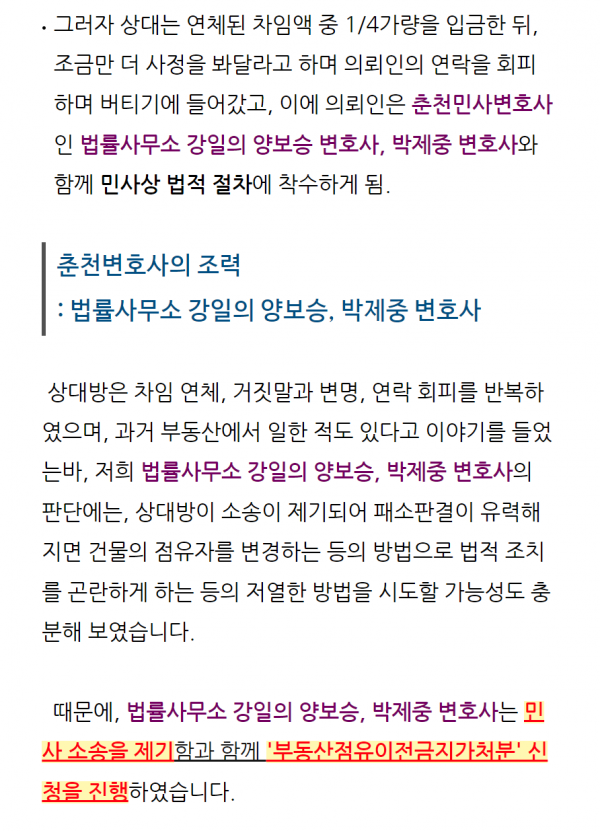 [민사] '점유이전금지가처분' 결정 후 '건물명도' 소송 진행 성공사례 페이지 정보 작성자 강일 댓글 0건 조회 1,404회 작성일 24-09-12 16:09 본문 <임차인에게 발송한 내용증명 중 발췌> <제출한 가처분 신청서 내용 중 발췌> <제출한 소장 내용 중 발췌> <부동산점유이전금지가처분 결정문> <법률사무소 강일 구성원> <민사법 전문분야 등록증서> 목록 이전글[형사] 형사 항소심 - 검사 항소기각 성공사례 24.09.24 다음글[형사] 음주 후 교통사고 피의자 "기소유예" 성공사례 24.08.29