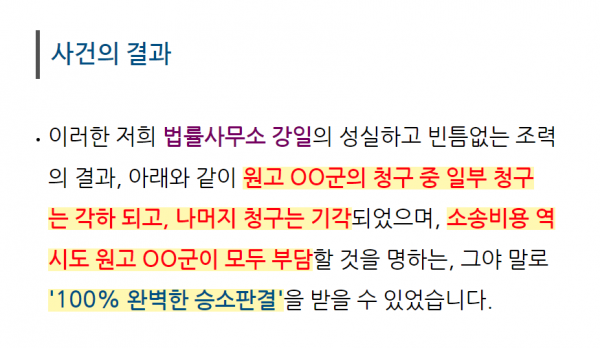 [민사] 지자체 상대 민사소송 100% 승소 사례 페이지 정보 작성자 강일 댓글 0건 조회 1,616회 작성일 24-05-03 14:14 본문 <의뢰인이 받은 소장 중 발췌> <제출한 준비서면들 중 발췌> <1심 판결문 중 발췌> <법률사무소 강일 구성원> <민사법 전문분야 등록증서> 목록 이전글[형사] '특수폭행' 형사조정 후 '기소유예' 성공사례 24.05.28 다음글[가사] 상간 피소 '위자료 80% 감액' 성공사례 24.04.29