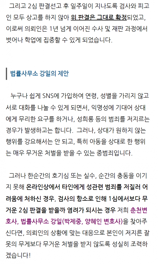 [형사] 아동복지법위반 2심 "검사 항소 기각" 성공 사례 페이지 정보 작성자 강일 댓글 0건 조회 2,948회 작성일 22-07-28 17:08 본문 <2심 판결 등본> <법률사무소 강일 구성원> <형사법 전문분야 등록증서> 목록 이전글[형사] 무고로 인한 '음주운전' 무혐의 성공 사례 22.08.08 다음글[민사] '학교 내 괴롭힘' 손해배상청구 성공사례 22.07.19